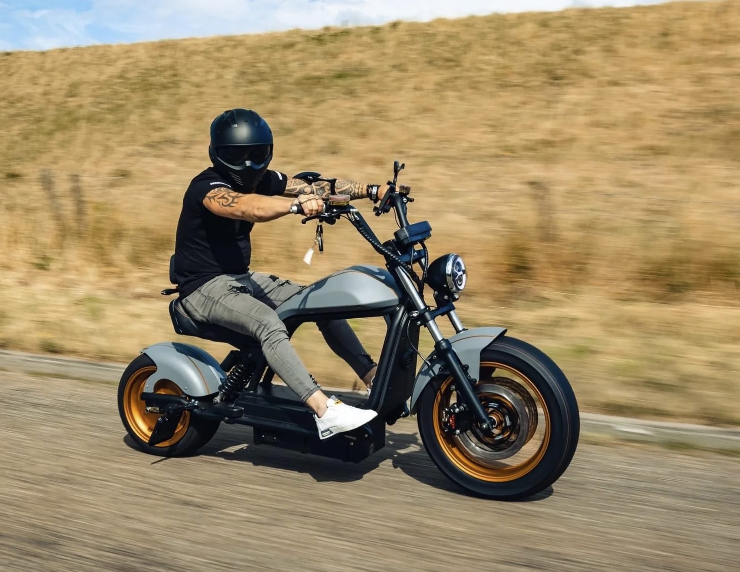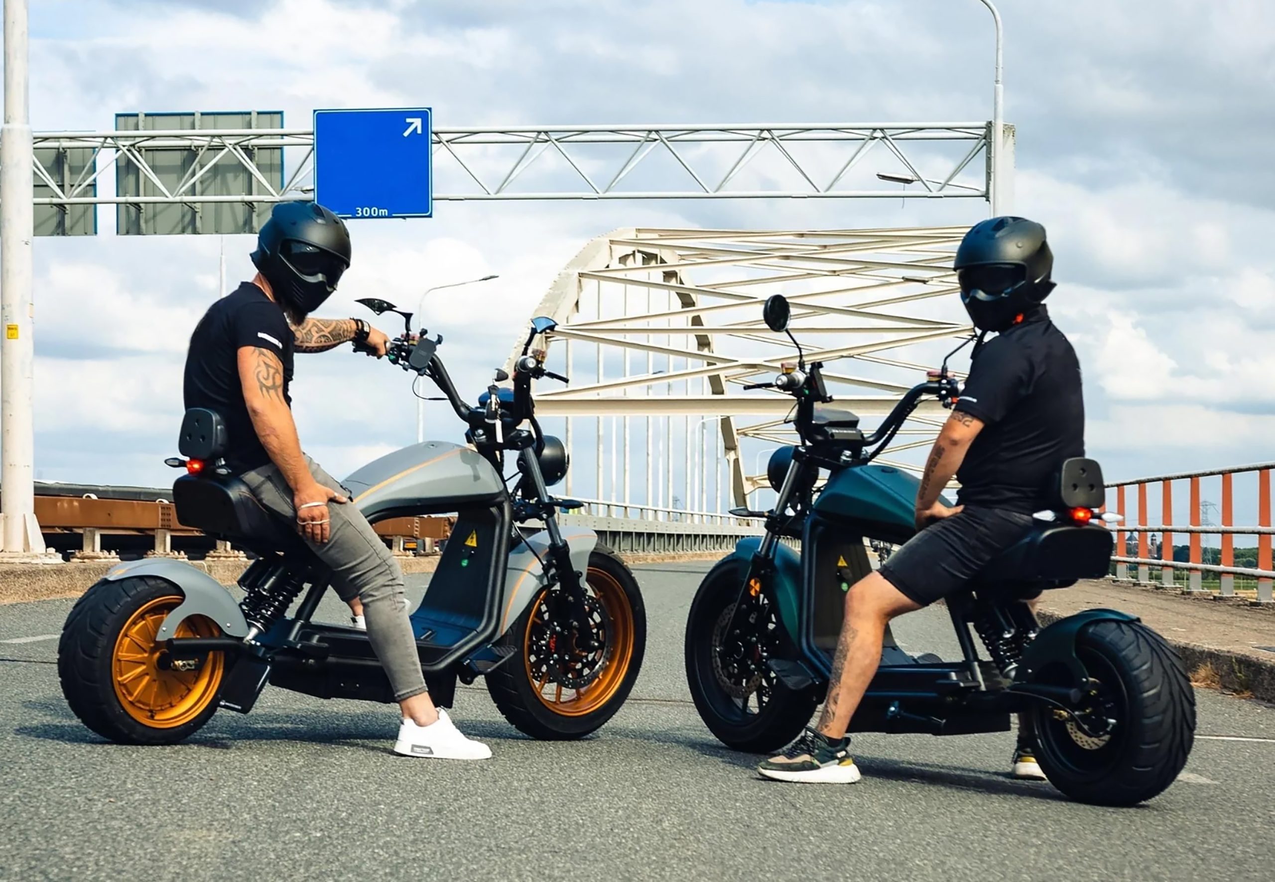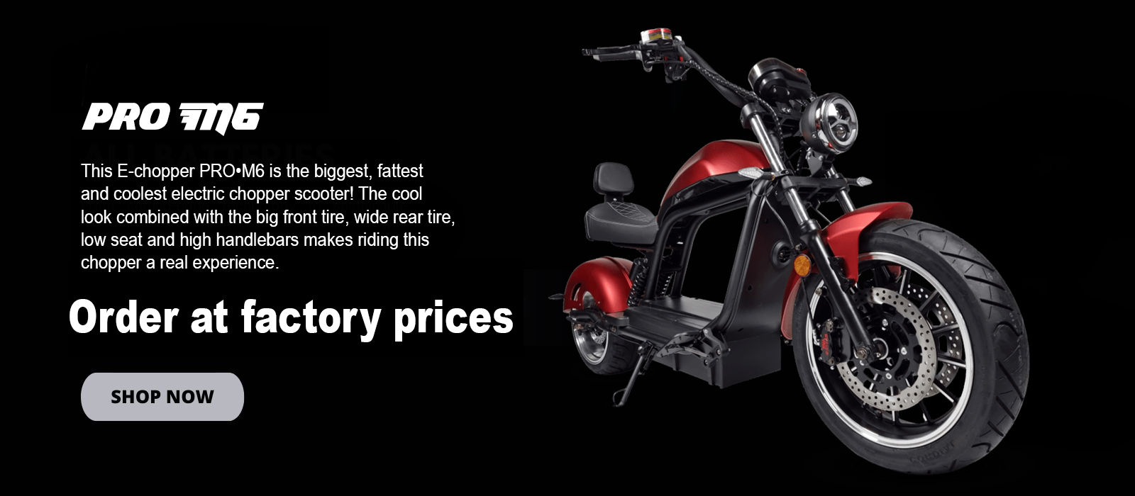 SPECIFICATION PRO•M6 Removable 11 kg lithium-ion battery (60 V/30 Ah 45 Ah /56.5 Ah battery) 1,500 charging cycles, low-wear and low-noise electric motor, 10 Ah charger per hour Removable 15 kg lithium-ion battery (60 V/45 Ah battery), approx. 1,500 charging cycles, low-wear and low-noise electric motor, 10 Ah charger per hour Motor power: 2.000 watts /3.000 watts The 3,000 watt motor power is indicated on the frame number by the code ‘M40’. The PRO•M6 with the 60 V/56.5 Ah lithium battery also features a Bluetooth sound system and a 5-inch TFT display. Road legal (CoC papers included) Weight: 96 kg Speed: 45 km/h, maximum speed is 68 km/h when de-throttled. Dimensions: Length: 212 cm, Height: 114 cm, Width including handlebars: 97 cm Tire size: Front wheel 17″ (140/70 – 17;), rear wheel 13″ (215/40 – 13) Approval: 1 person Max load: 200 kg Range, 30 Ah: up to 70 km, Range 45 Ah: up to 100 km, Range 56.5 Ah: up to 120 km Indicators: Battery charge indicator, speedometer with odometer LED headlights, parking lights, low beams, high beams (front and rear) Virtually no maintenance costs as the electric motor essentially has no wear and tear 30-day Buy n Try return policy The PRO•M6 is delivered 90% pre-assembled. Scope of delivery: Electric scooter including removable lithium-ion battery, charger, and manual